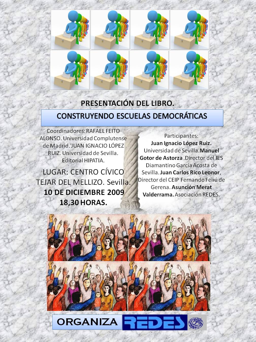 El próximo 10 de Diciembre (jueves) a las 18,30 en el Centro Cívico Tejar del Mellizo (Parque de los Príncipes) se celebrara un Mesa Redonda, organizada por REDES, para presentar el libro "Construyendo escuelas democráticas", editado por Hipatia.
