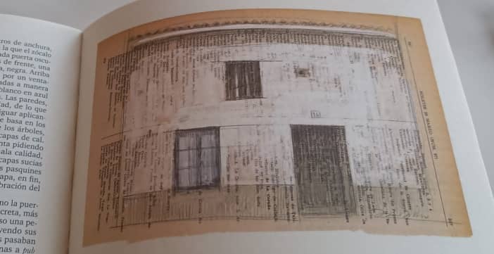 utiliza como soporte las hojas amarillentas de Boletines del Estado del año 1946 generando un efecto que nos atrevemos a calificar de extrañamiento, de distorsión de la realidad.